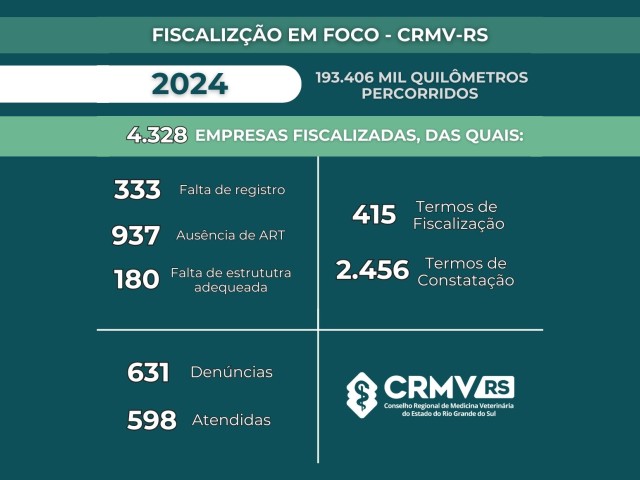 O último Fiscalização em Foco de 2024 apresenta um levantamento sobre o trabalho realizado pela Unidade de Fiscalização Profissional do Conselho Regional de Medicina Veterinária do Estado do Rio Grande do Sul (CRMV-RS) ao longo do ano. A fiscalização percorreu 193.406 quilômetros em todo o Estado, totalizando centenas de municípios visitados. Foram lavrados 4.328 atos fiscalizatórios nas empresas novas e registradas, com 333 empresas autuadas por falta de registro, 937 por ausência de Anotação de Responsabilidade Técnica e 180 por falta de estrutura em serviços médicos-veterinários.