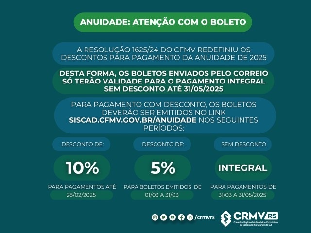Para pagamento com desconto, os boletos DEVERÃO ser emitidos através do link siscad.cfmv.gov.br/anuidade nos seguintes períodos: