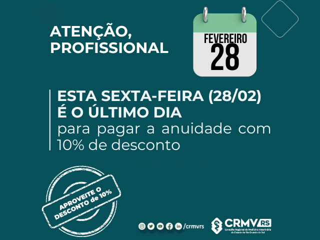 O prazo para pagar a anuidade do CRMV-RS com 10% de desconto está chegando ao fim! ⏳💳