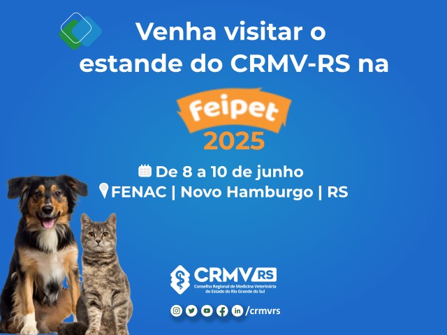 📣 De 8 a 10 de junho, o Conselho Regional de Medicina Veterinária do Estado do Rio Grande do Sul marca presença na 8ª edição da FEIPET – Feira de Negócios para Animais de Estimação, na Fenac, em Novo Hamburgo/RS.