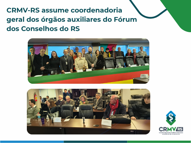 O médico-veterinário José Pedro Soares Martins, assessor técnico do Conselho Regional de Medicina Veterinária do Estado Rio Grande do Sul (CRMV-RS), foi eleito coordenador geral dos órgãos auxiliares do Fórum dos Conselhos do RS, durante reunião realizada na última segunda-feira (28/07), na sede da OAB-RS, em Porto Alegre. A escolha marca um novo ciclo de atuação conjunta dos conselhos profissionais do Estado, com a retomada das atividades do Fórum.
