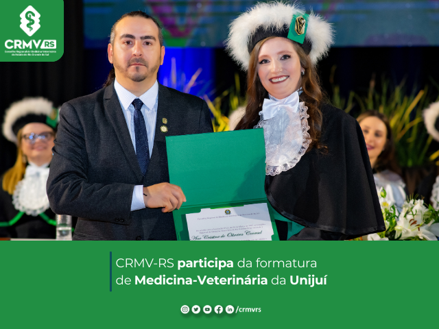 No sábado, 2 de agosto de 2025, o Conselho Regional de Medicina Veterinária do Rio Grande do Sul (CRMV-RS) esteve presente na solenidade de colação de grau dos formandos em Medicina Veterinária da Universidade Regional do Noroeste do Estado do Rio Grande do Sul (Unijuí). Representando a autarquia, o conselheiro Murilo Marchi participou da cerimônia e realizou a entrega do Mérito Acadêmico à formanda Ane Cristine de Oliveira Conrad, em reconhecimento ao seu destaque e desempenho durante o curso.