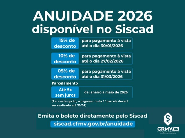 O CRMV-RS informa que os boletos da anuidade 2026 já estão disponíveis para profissionais e pessoas jurídicas. A emissão deve ser feita exclusivamente pelo site www.crmvrs.gov.br, por meio do botão “Anuidade 2026” ...