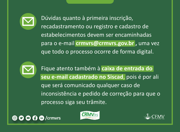 Dúvidas quanto à primeira inscrição, recadastramento ou registro e cadastro de estabelecimentos devem ser encaminhadas para o email crmvrs@crmvrs.gov.br, uma vez que todo o processo ...