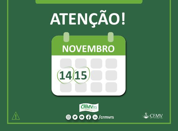 O Conselho Regional de Medicina Veterinária do Estado do Rio Grande do Sul (CRMV-RS) suspenderá o atendimento no dia 14 e 15 de Novembro (segunda-feira e terça-feira), sendo em comemoração do Dia do Servidor Público, que foi postergado, e o feriado nacional do Dia a Proclamação ...