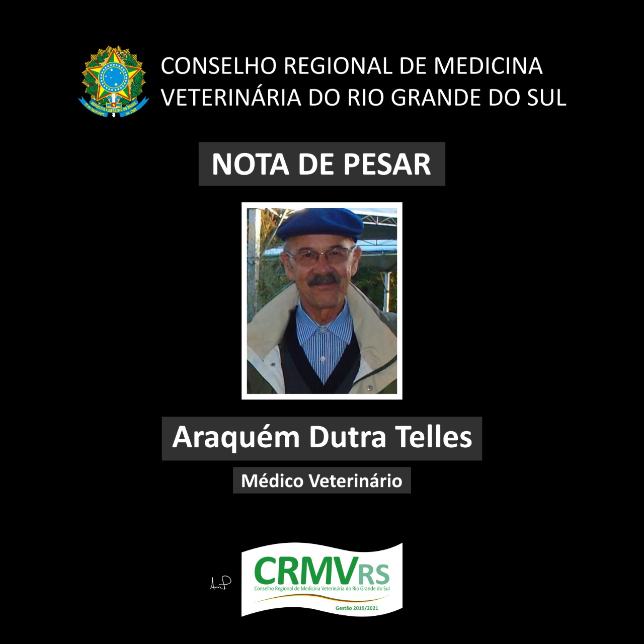 É com profundo pesar que o Conselho Regional de Medicina Veterinária do Rio Grande do Sul (CRMV-RS) lamenta o falecimento do colega Araquém Dutra Telles, ocorrido no último domingo, dia 28 ...