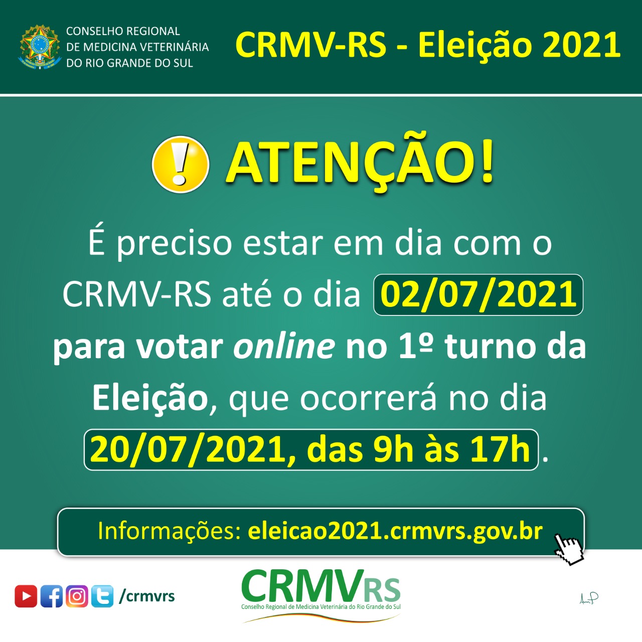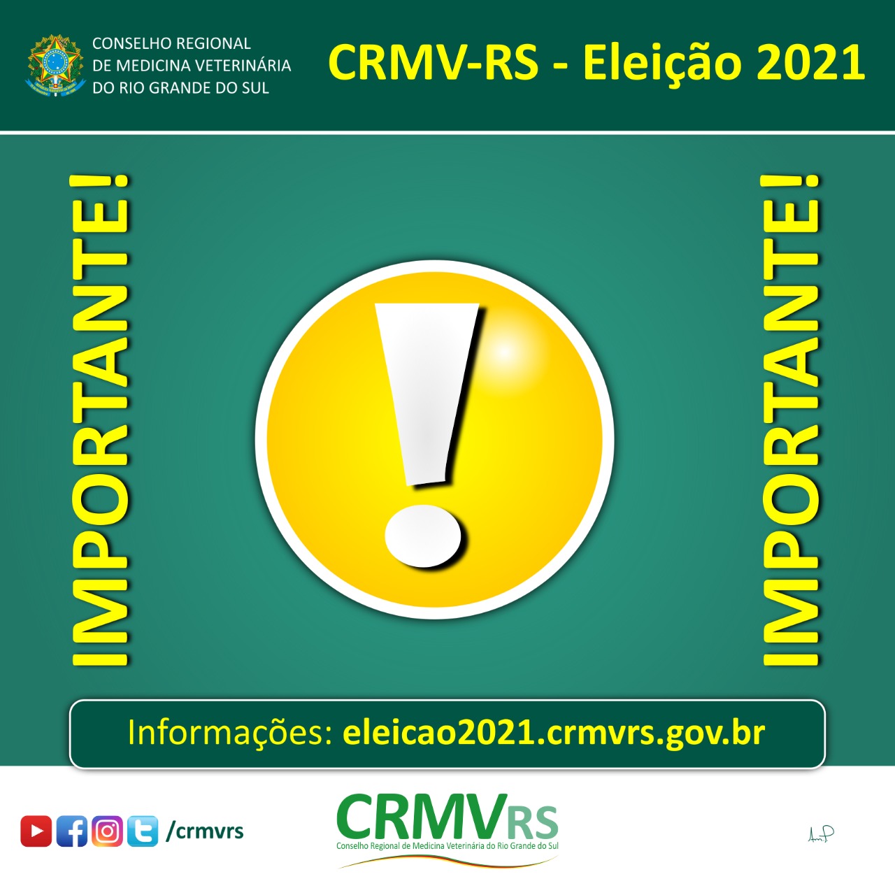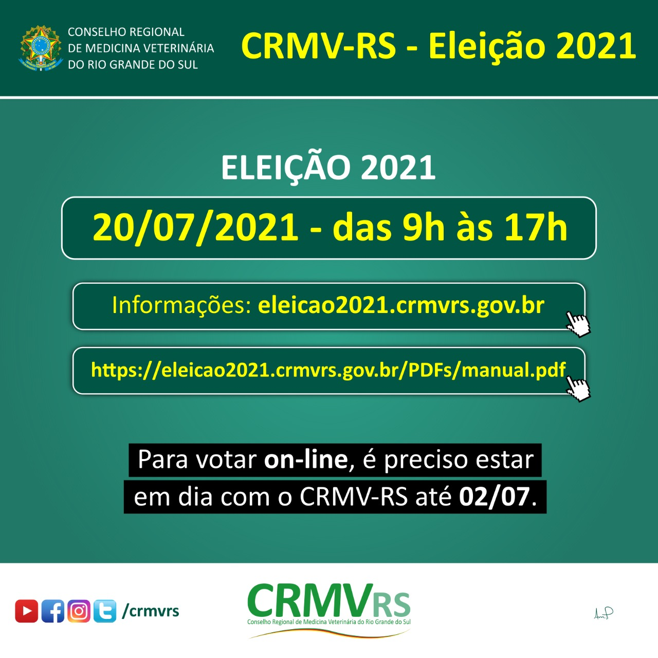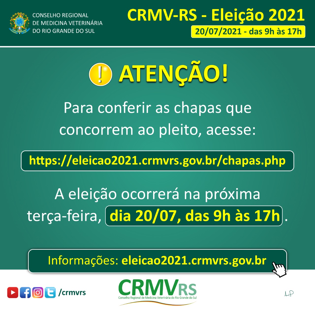 As eleições CRMV-RS 2021 acontecem na próxima terça-feira, dia 20/07, das 9h às 17h. Confira as chapas que concorrem ao pleito no site: eleicao2021.crmvrs.gov.br ...