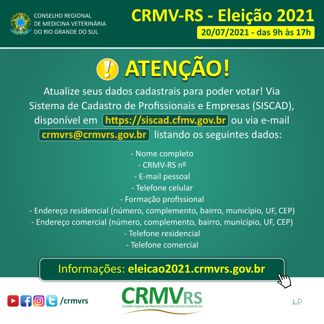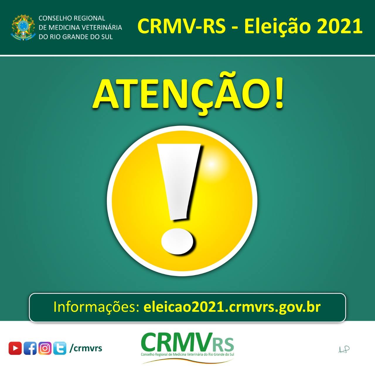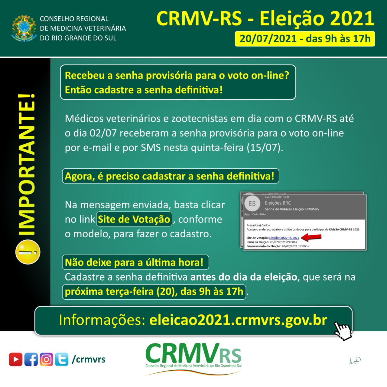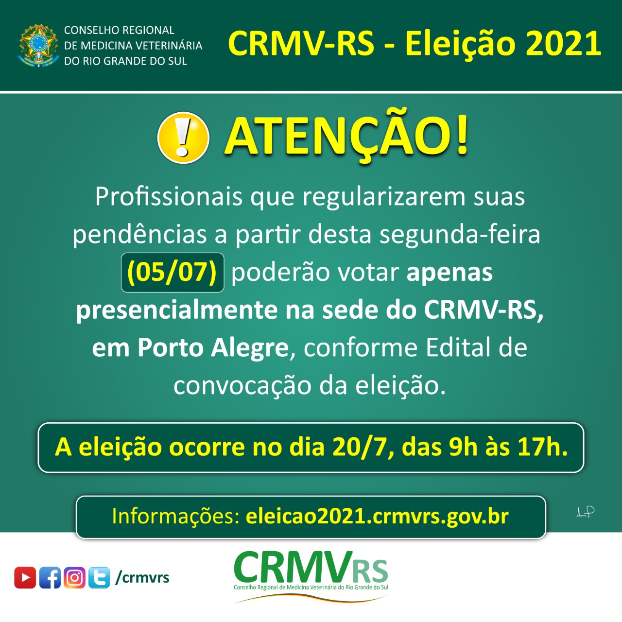 As eleições CRMV-RS 2021 acontecem na próxima terça-feira, dia 20/07, das 9h às 17h. Confira as chapas que concorrem ao pleito no site: eleicao2021.crmvrs.gov.br ...