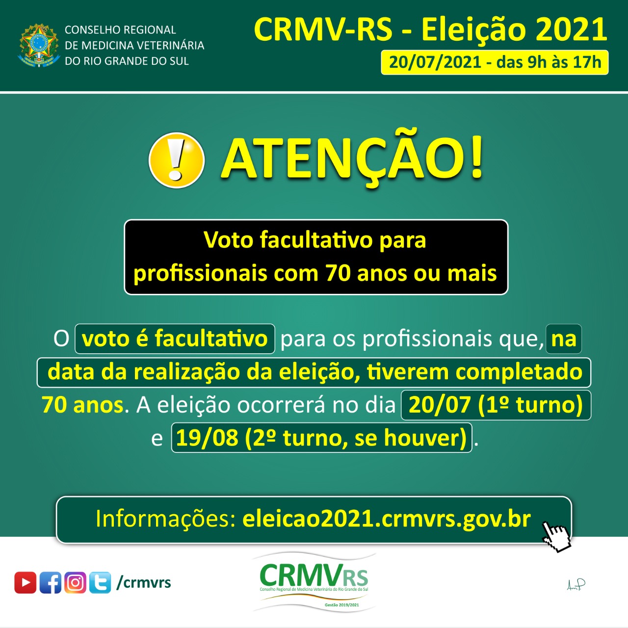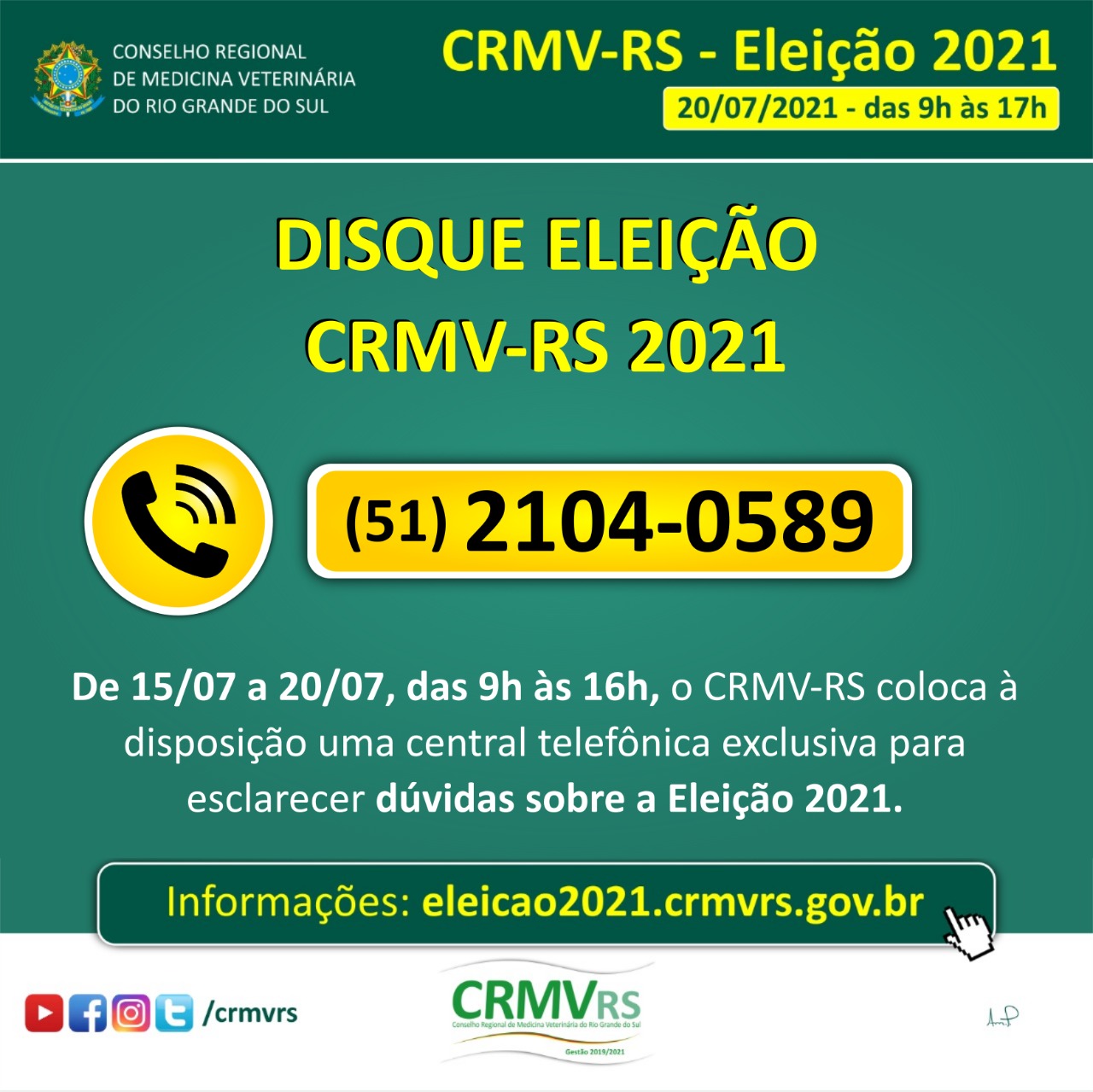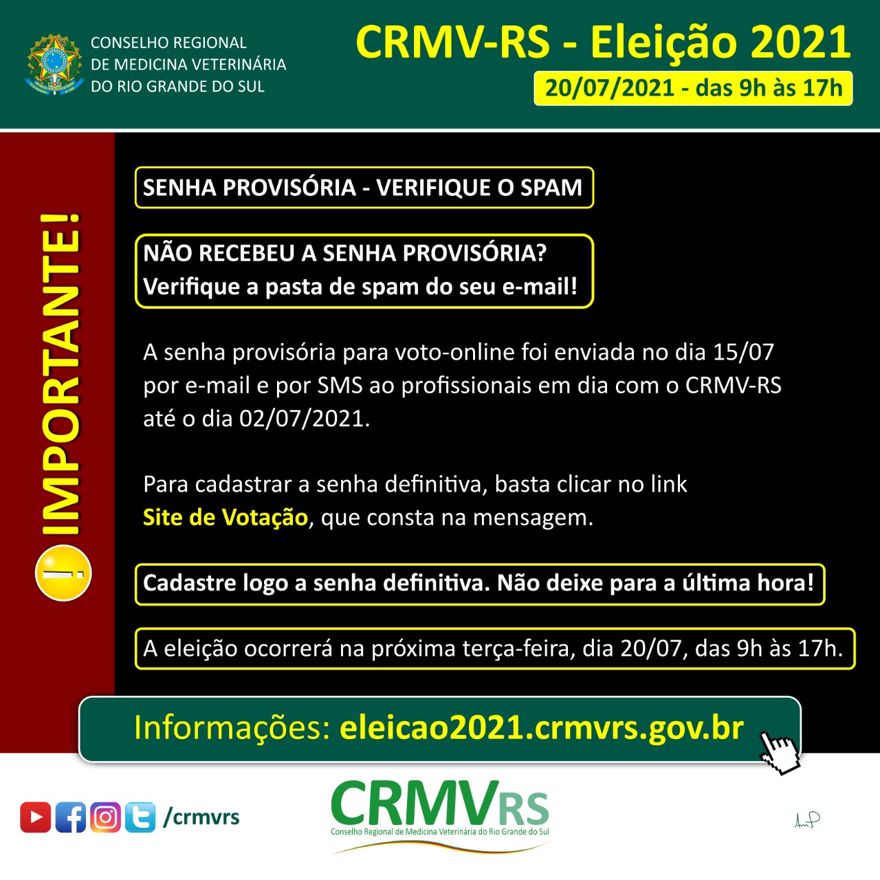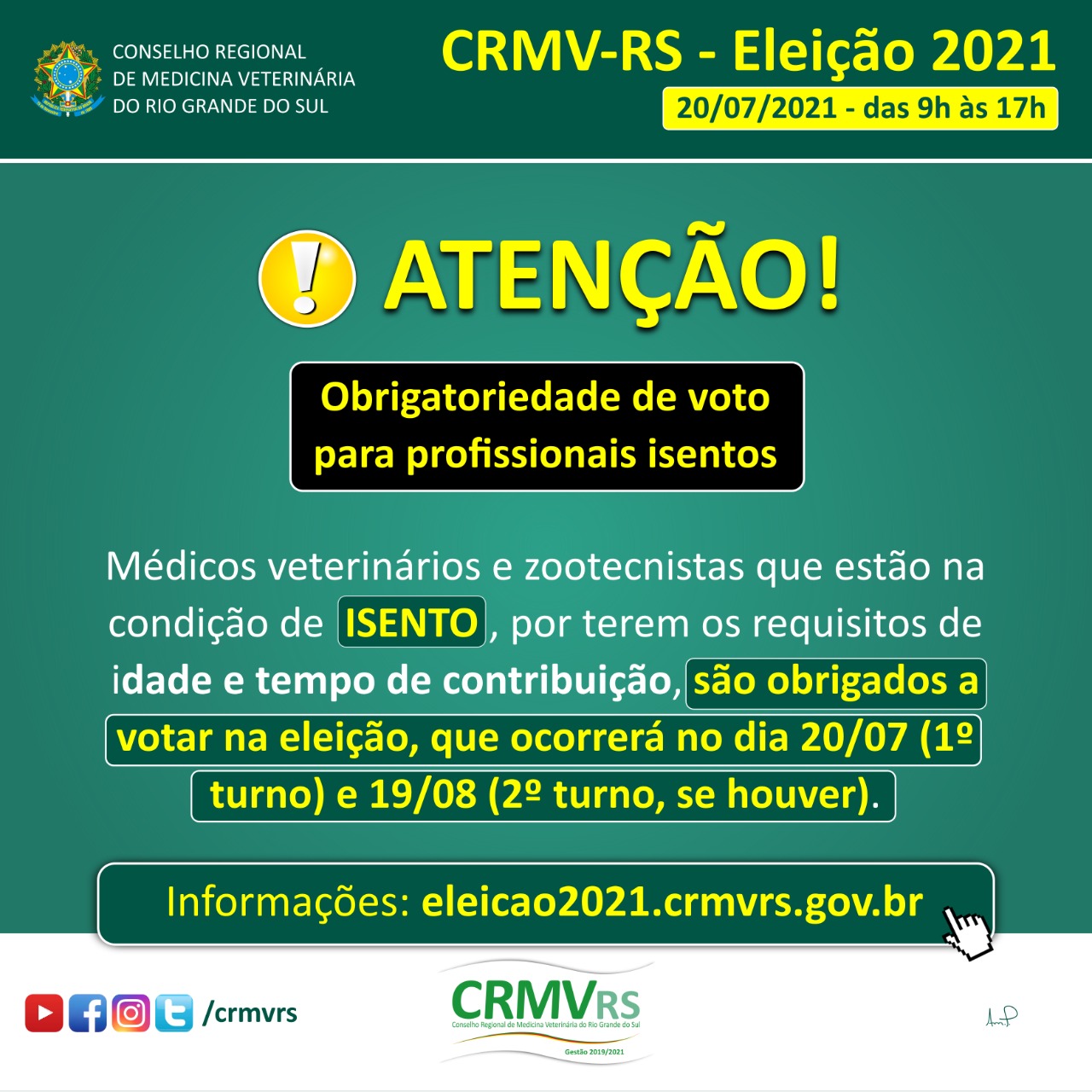 As eleições CRMV-RS 2021 acontecem na próxima terça-feira, dia 20/07, das 9h às 17h. Confira as chapas que concorrem ao pleito no site: eleicao2021.crmvrs.gov.br ...