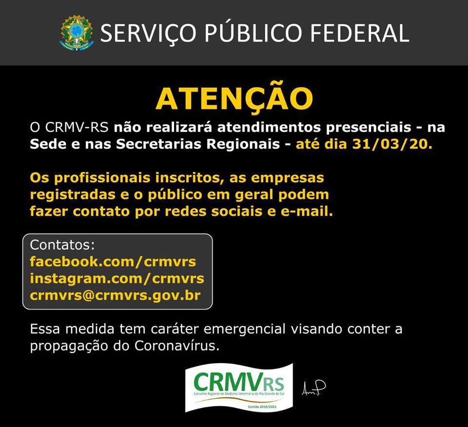 Em função da pandemia do novo coronavírus (Covid-19) e devido à Medicina Veterinária ser uma profissão comprometida com a manutenção da Saúde Única (animal, humana e ambiental), o Sistema CFMV/CRMVs ...