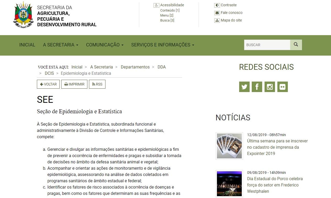 O relatório epidemiológico da 31ª semana de 2019 está disponível para consulta no link https://www.agricultura.rs.gov.br/see. O documento, realizado pela Seção de Epidemiologia e Estatística (SEE), da Secretaria da Agricultura, Pecuária e Desenvolvimento Rural do Rio Grande do Sul ...