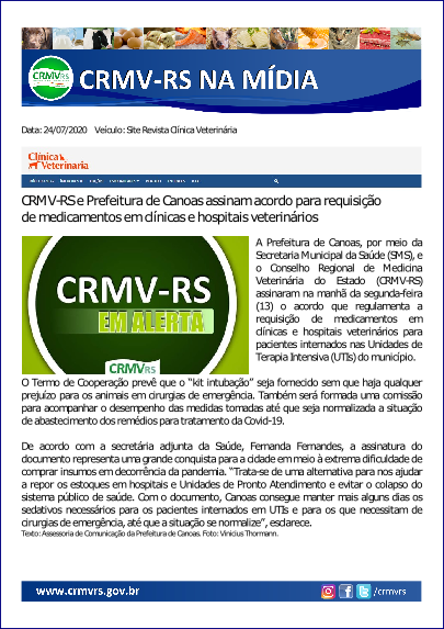 Data:23/07/2020 Pauta:CRMV-RS e Prefeitura de Canoas assinam acordo para requisição de medicamentos em clínicas e hospitais veterinários Veículo: Revista Clínica Veterinária Editoria: Geral Página: Online
