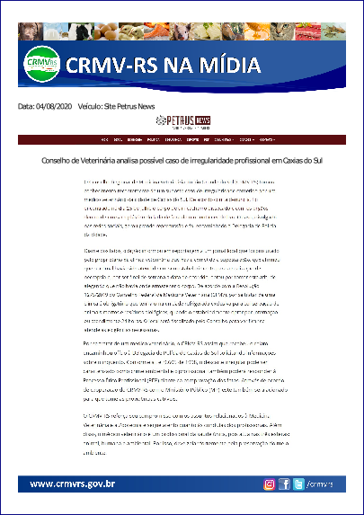 Data:04/08/2020 Pauta: Conselho de Veterinária analisa possível caso de irregularidade em Caxias do Sul Veículo: Site Petrus News Editoria: Geral Página: Online