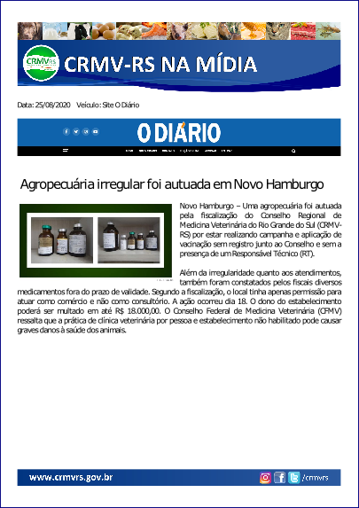Data:25/08/2020 Pauta:Agropecuária de Novo Hamburgo é autuada Veículo: Site O Diário Editoria: Geral Página: Online