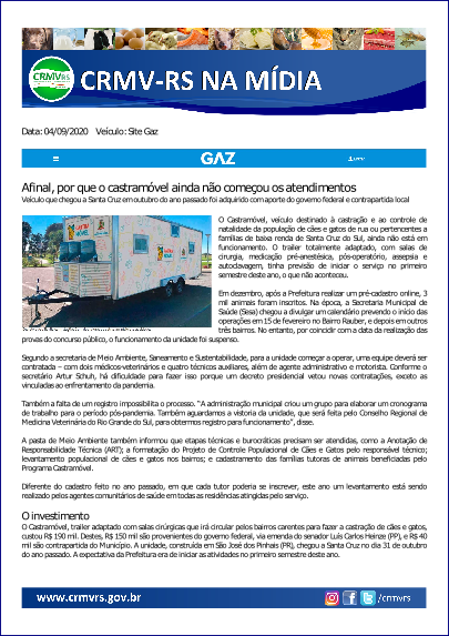 Data:04/09/2020 Pauta:Por que o castramóvel ainda não começou os atendimentos Veículo: Site Gaz Editoria: Geral Página: Online