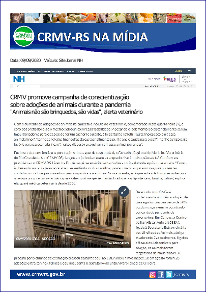 Data:09/09/2020 Pauta:CRMV-RS promove campanha sobre adoção consciente na pandemia Veículo: Site Jornal NH Editoria: Geral Página: Online