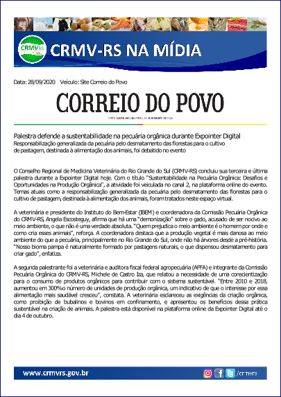 Data:28/09/2020 Pauta:Palestra defende a sustentabilidade na pecuária orgânica durante Expointer Digital Veículo: Site Correio do Povo Editoria: Geral Página: Online