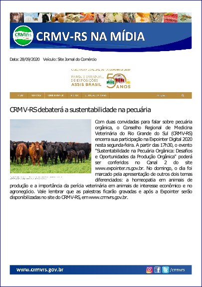 Data:28/09/2020 Pauta:CRMV-RS debaterá a sustentabilidade na pecuária Veículo: Site Jornal do Comércio Editoria: Geral Página: Online
