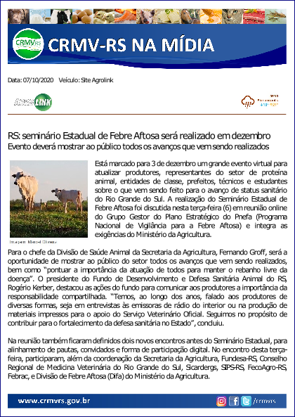 Data:07/10/2020 Pauta:Seminário Estadual de Febre Aftosa será realizado em dezembro Veículo: Site Agrolink Editoria: Geral Página: Online