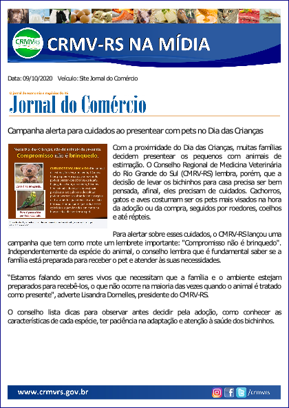 Data:09/10/2020 Pauta:Campanha alerta para cuidados ao presentear com pets no Dia das Crianças Veículo: Site Jornal do Comércio Editoria: Geral Página: Online