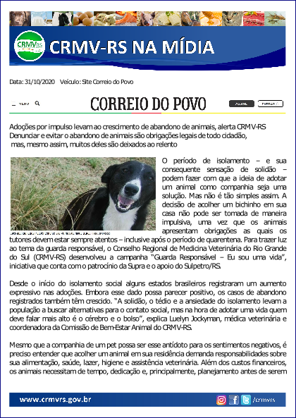 Data:31/10/2020 Pauta:Adoções por impulso levam ao crescimento de abandono de animais, alerta CRMV-RS Veículo: Site Correio do Povo Editoria: Geral Página: Online