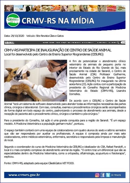 Data:29/10/2020 Pauta:CRMV-RS PARTICIPA DE INAUGURAÇÃO DE CENTRO DE SAÚDE ANIMAL Veículo: Site Revista Cães e Gatos Editoria: Geral Página: Online