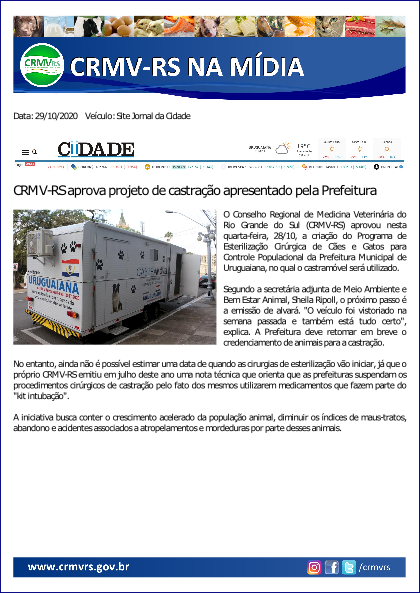 Data:29/10/2020 Pauta:CRMV-RS aprova projeto de castração apresentado pela Prefeitura Veículo: Site Jornal da Cidade - Uruguaiana Editoria: Geral Página: Online