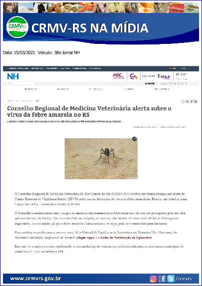 Data:15/03/2021 Pauta:CRMV-RS alerta sobre o vírus da febre amarela no RS Veículo: Site Jornal NH Editoria: Geral Página: Online