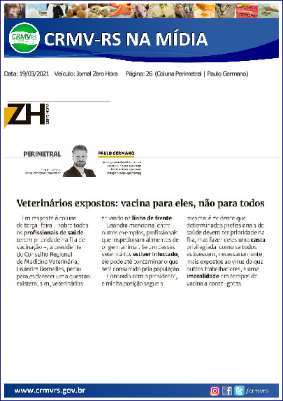 Data:19/03/2021 Pauta:Veterinários expostos: Vacinas para eles, não para todos Veículo: Jornal Zero Hora Editoria: Coluna Perimetral - Paulo Germano Página: 26