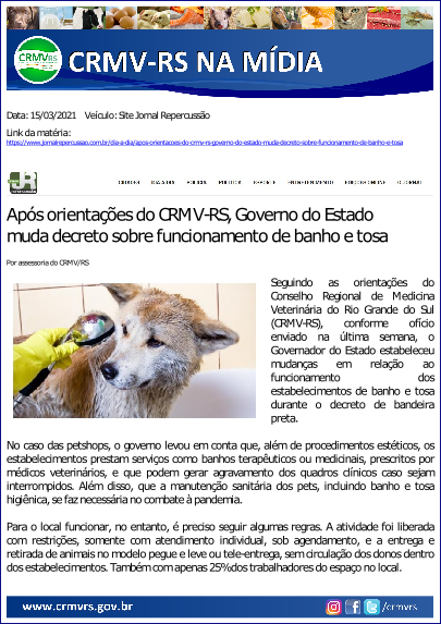 Data:15/03/2021 Pauta:Após orientações do CRMV-RS, Governo do Estado muda decreto sobre funcionamento de banho e tosa Veículo: Site Jornal Repercussão Editoria: Geral Página: Online