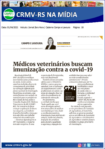 Data:01/04/2021 Pauta:Médicos Veterinários buscam imunização contra a Covid-19 Veículo: Jornal Zero Hora Editoria: Campo e Lavoura Página: 18