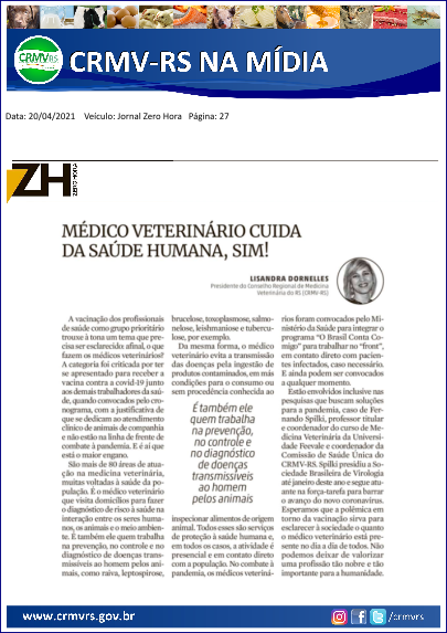 Data:20/04/2021 Pauta:Médico Veterinário cuida da saúde humana sim | Artigo Lisandra Dornelles Veículo: Jornal Zero Hora Editoria: Artigos Página: 27