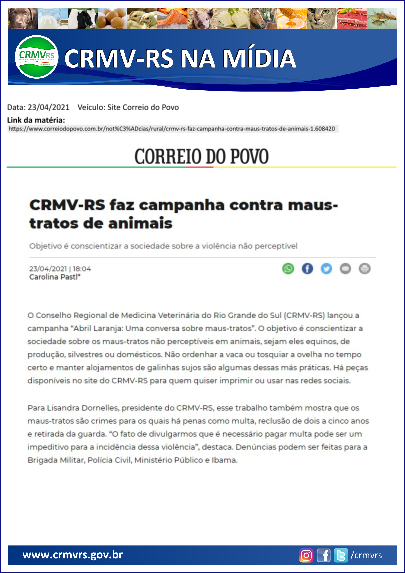 Data:24/04/2021 Pauta:CRMV-RS faz campanha contra maus-tratos Veículo: Jornal Correio do Povo Editoria: Rural Página: 12