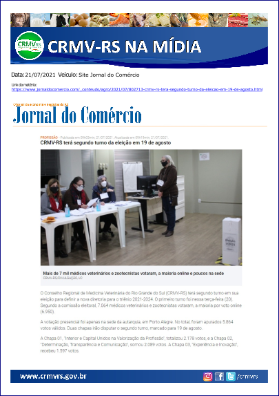Data:21/07/2021 Pauta:CRMV-RS terá segundo turno da eleição em 19 de agosto Veículo: Site Jornal do Comércio Editoria: Geral Página: Online
