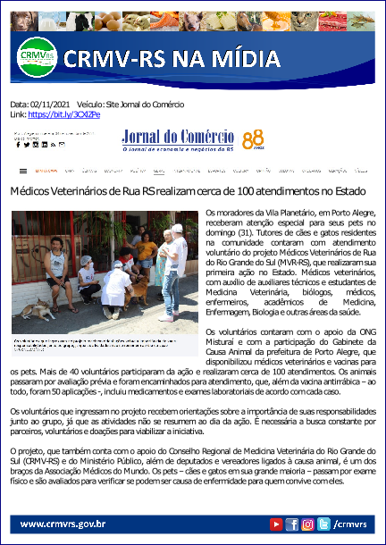 Data:02/11/2021 Pauta:Médicos Veterinários de Rua RS realizam cerca de 100 atendimentos no Estado Veículo: Site Jornal do Comércio Editoria: Geral Página: Online