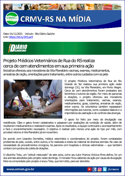 Data:02/11/2021 Pauta:Médicos Veterinários de Rua RS realizam cerca de 100 atendimentos no Estado Veículo: Site Diário Gaúcho Editoria: Geral Página: Online