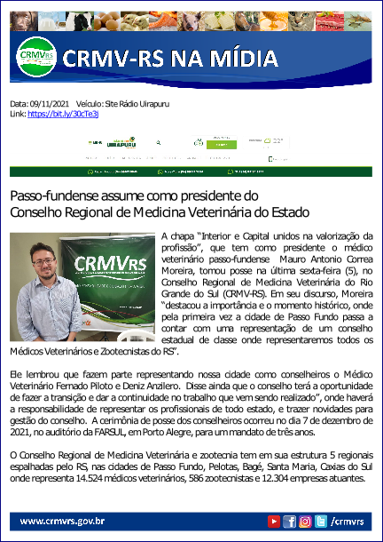Data:09/11/2021 Pauta:Passo-fundense assume como presidente do Conselho Regional de Medicina Veterinária do Estado Veículo: Site Rádio Uirapuru Editoria: Geral Página: Online