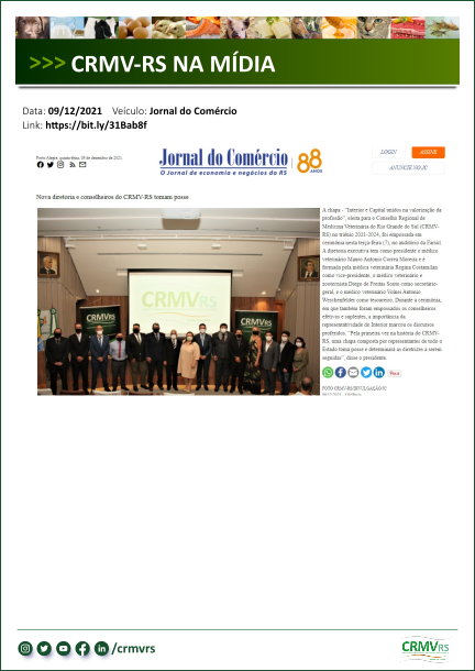 Data:09/12/2021 Pauta:Nova Diretoria e Conselheiros do CRMV-RS tomam posse Veículo: Site Jornal do Comércio Editoria: Geral Página: Online