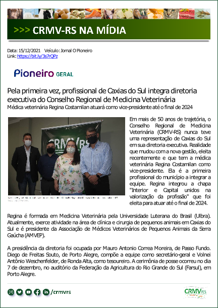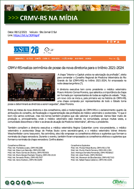 Data:08/12/2021 Pauta:CRMV-RS realiza cerimônia de posse da nova diretoria para o triênio 2021-2024 Veículo: Site Jornal O Sul Editoria: Geral Página: Online