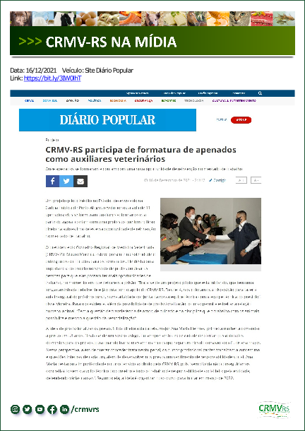 Data:16/12/2021 Pauta:CRMV-RS participa de formatura de apenados como auxiliares veterinários Veículo: Site Diário de Pelotas Editoria: Geral Página: Online