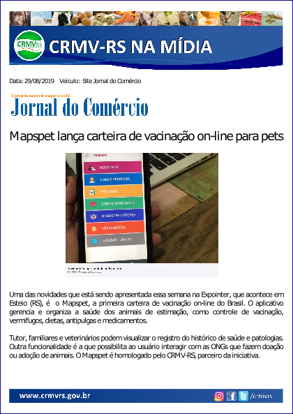 Data:29/08/2019 Pauta:Aplicativo Mapspet - Carteira de Vacinação Pet Veículo: Site Jornal do Comércio Editoria: Economia - Mercado Digital Página: Online