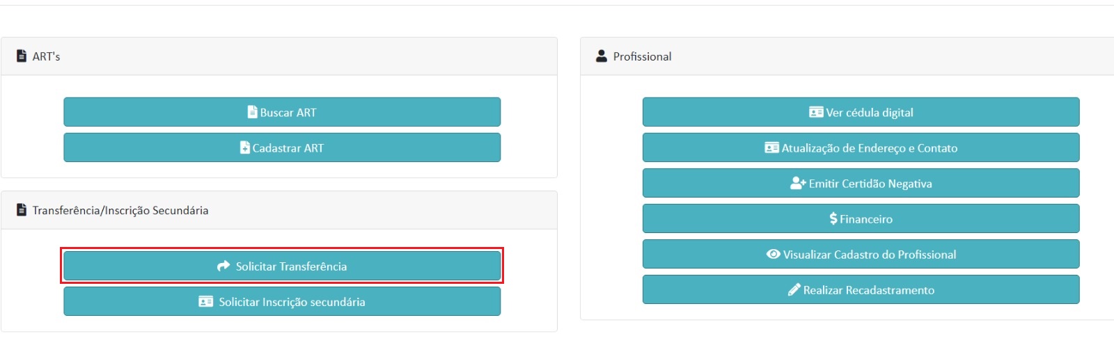 Siscad Web e acessar como profissional. Depois de logado no sistema, clicar em “Solicitar Transferência”.